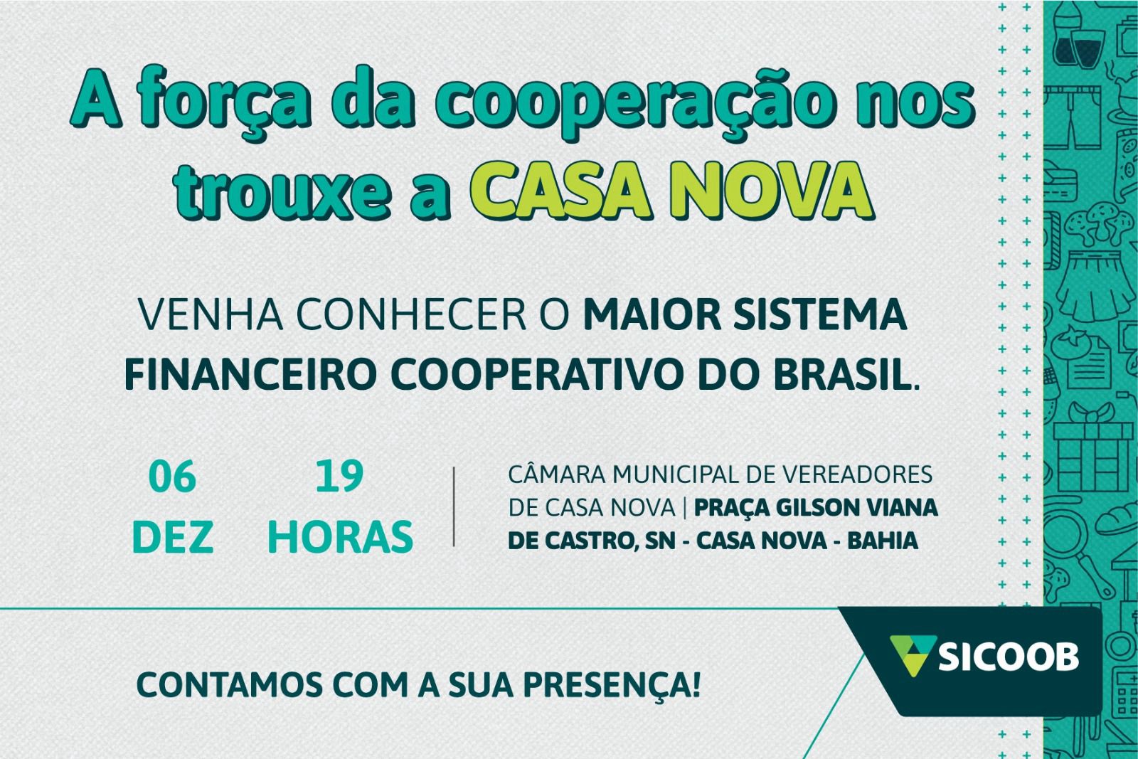 Na próxima quarta-feira (06/12), às 19h00, a população de Casa Nova/BA está convidada a participar e conhecer de perto o maior sistema financeiro cooperativo do Brasil, o Sicoob. O evento vai acontecer na Câmara de Vereadores da cidade, localizado na Praça Gilson Viana de Castro, S/N°. Na ocasião, teremos a presença do presidente do Sicoob Coopemar, Vandevaldo Rios, conhecido também como Carneiro.