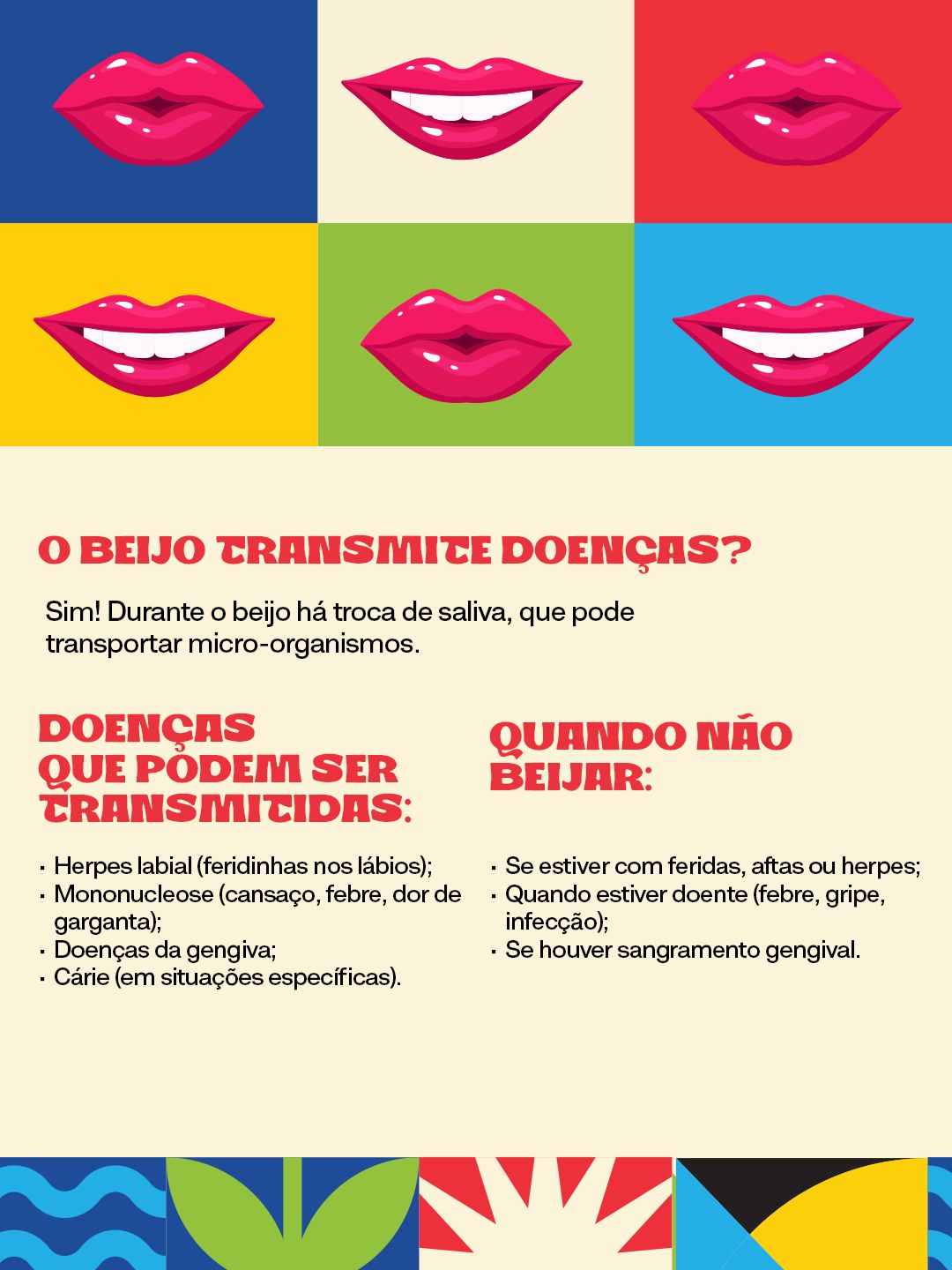 Segundo a diretora de Saúde Bucal da Sesau, Bruna Diaz, durante o beijo ocorre a troca de saliva, o que pode facilitar a transmissão de vírus e bactérias. “Entre as principais doenças que podem ser transmitidas estão a herpes labial, caracterizada por feridas nos lábios; a mononucleose, conhecida como ‘doença do beijo’, que provoca sintomas como febre, cansaço e dor de garganta; além de doenças gengivais e, em alguns casos, a cárie”, explica.