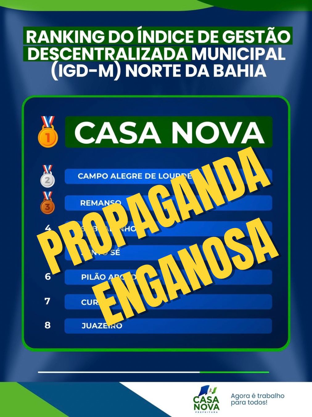 A Prefeitura de Casa Nova enviou para a imprensa texto que tenta convencer a população de que o município vive um ciclo de “desenvolvimento” reconhecido na Bahia e no Brasil. A narrativa se apoia quase exclusivamente no Índice de Gestão Descentralizada Municipal (IGD-M), apresentado de forma genérica e conveniente. O problema é simples e grave: o IGD-M não mede desenvolvimento. Mede apenas a qualidade administrativa da gestão do Programa Bolsa Família.