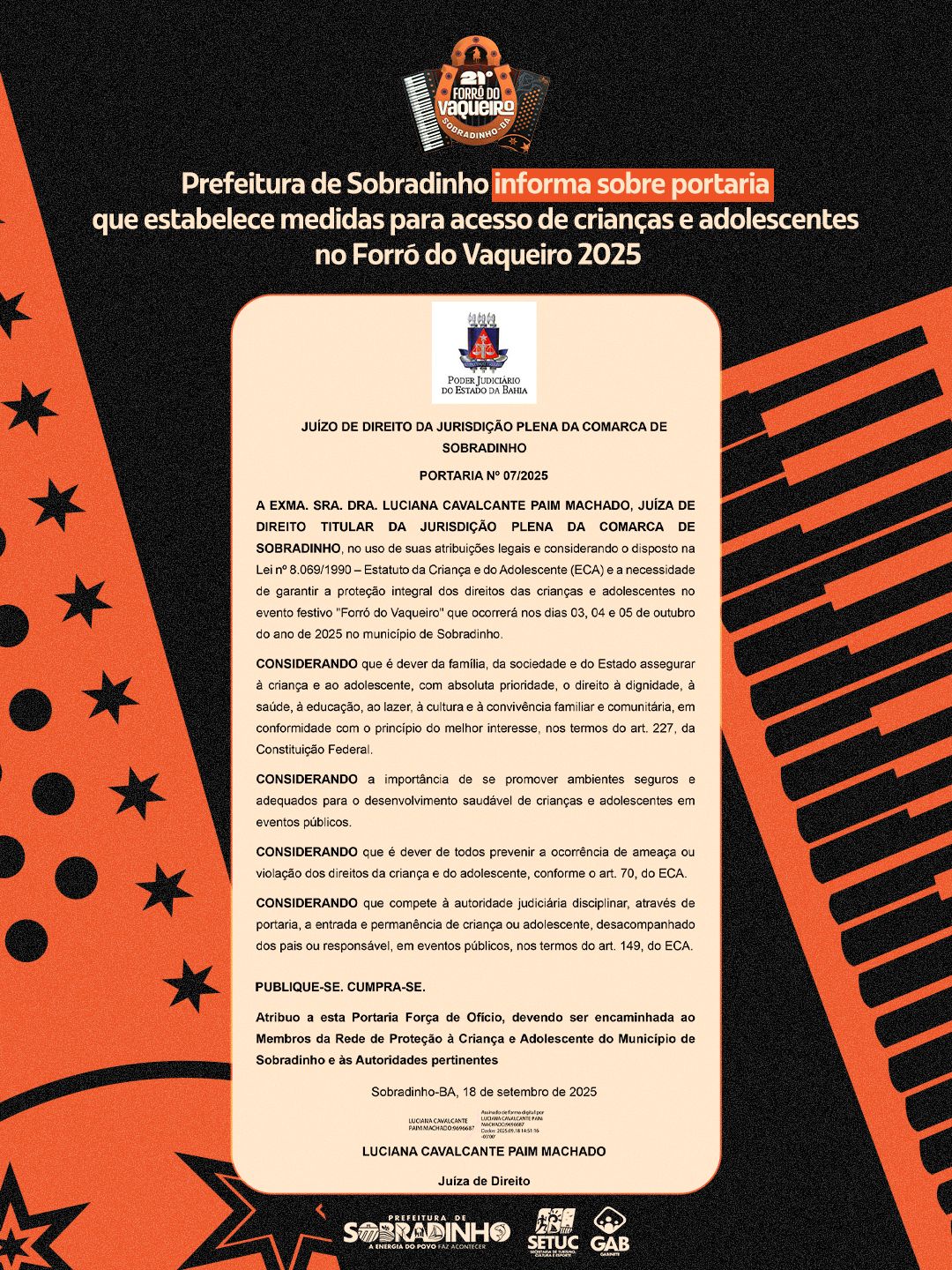 Após reunião com representantes da prefeitura de Sobradinho e com as forças de segurança, a Juíza da comarca de Sobradinho emitiu uma portaria que estabelece diretrizes para a entrada e permanência de crianças e adolescentes no “Forró do Vaqueiro”, que acontece nos dias 3, 4 e 5 de outubro.