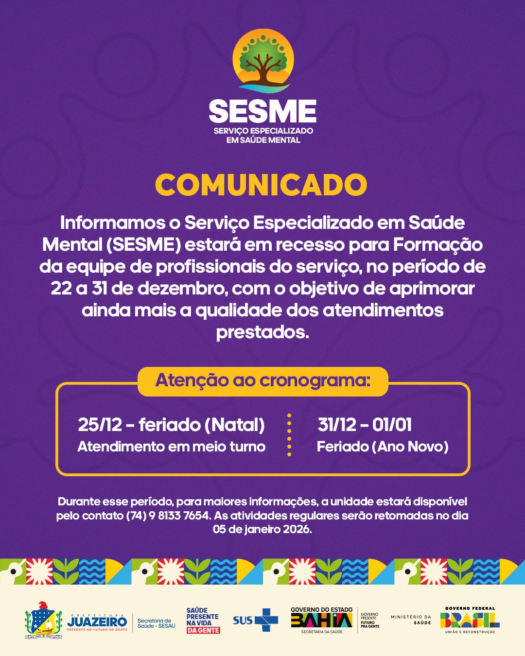 A Secretaria Municipal de Saúde de Juazeiro (Sesau) informa à população que o Serviço Especializado em Saúde Mental (SESME) estará em recesso a partir da próxima segunda-feira (22), até o dia de 31 de dezembro, em razão da realização de uma formação interna da equipe multiprofissional.